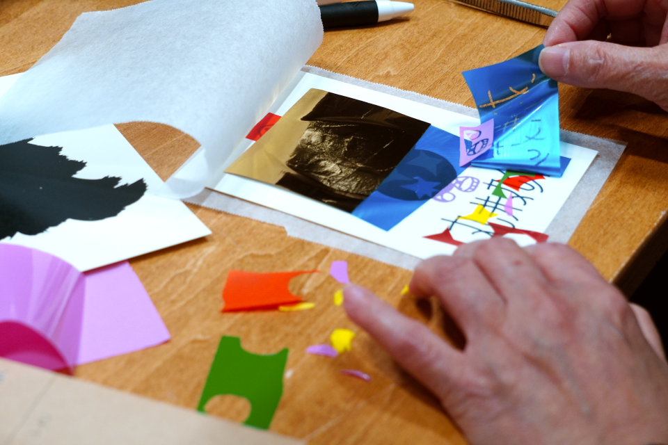 クリスマスカードの台紙の好きな位置に、カットしたトナー箔をレイアウトしていきます