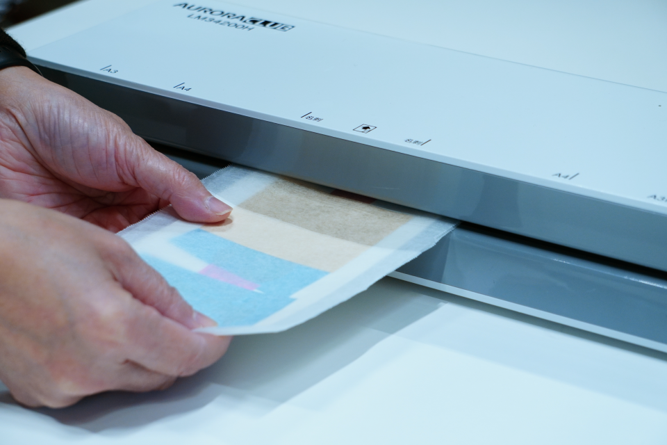 トナー箔のレイアウトが決まったら、ラミネーターを使って箔をカードに定着させます