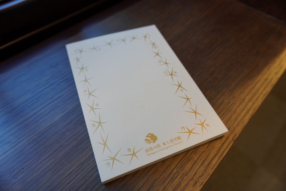 文庫本と同じサイズ・同じ紙でできたノートに、企画展「あつまれキラキラ★百箔繚乱」に登場するmysterious friends・純金太郎を箔押しするワークショップです。