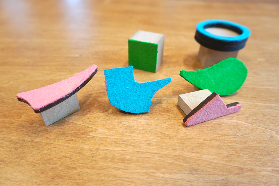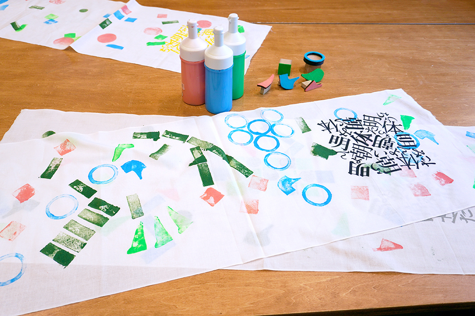 手ぬぐい用の反物を長く広げ、明朝体の点やハネ、ウロコなどのスタンプを思い思いに押して、手ぬぐいの地模様を作ります。最後にご自身で明朝体展のグラフィックをシルクスクリーン印刷し、その部分をカットしてお持ち帰りいただきます。どの地模様になるかは、作ったあとのお楽しみ!