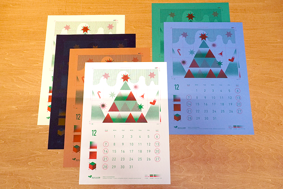 マンスリーカレンダーを印刷しながら、リソグラフの仕組みを学びましょう! 12月のテーマは「CHRISTMAS TREE」です。グラフィックの部分は仕上がりをイメージしながら、ご自身で版下を作成し、リソグラフで2色印刷します。