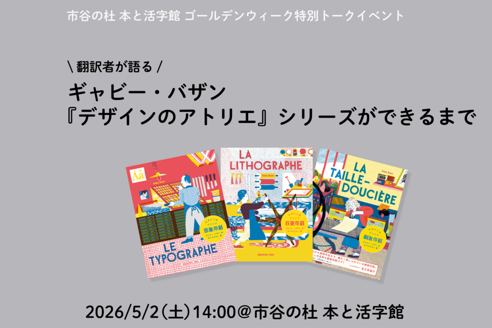 市谷の杜 本と活字館では、『デザインのアトリエ』シリーズの翻訳者であるみつじまちこさんをお招きし、日本語版シリーズの制作秘話や、ギャビー・バザン氏とのエピソードをお話しいただきます。