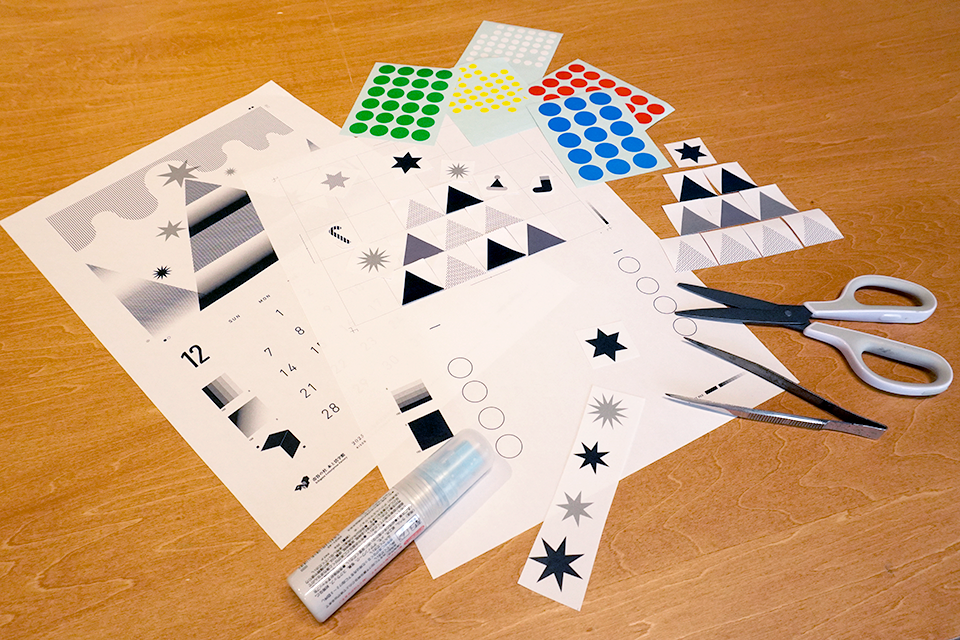 12月のテーマは「CHRISTMAS TREE」です。ブライトレッドとグリーンの2色のインキを使用して、様々なパーツを使ったグラフィックを制作します。仕上がりイメージがあるので、デザインが苦手な方でも安心です。ベースの版下にシールやデザインパーツを足して、オリジナルカレンダーにしてもOK!