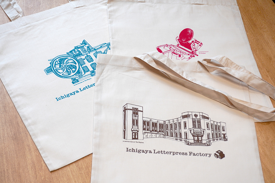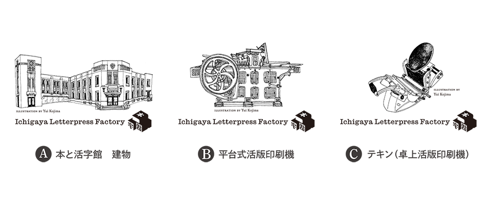 外観や平台印刷機、卓上活版印刷機をイラストにしました。