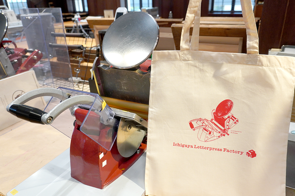 市谷の杜 本と活字館を象徴する建築や印刷機のイラストを、シルクスクリーンでトートバッグに印刷するワークショップです。