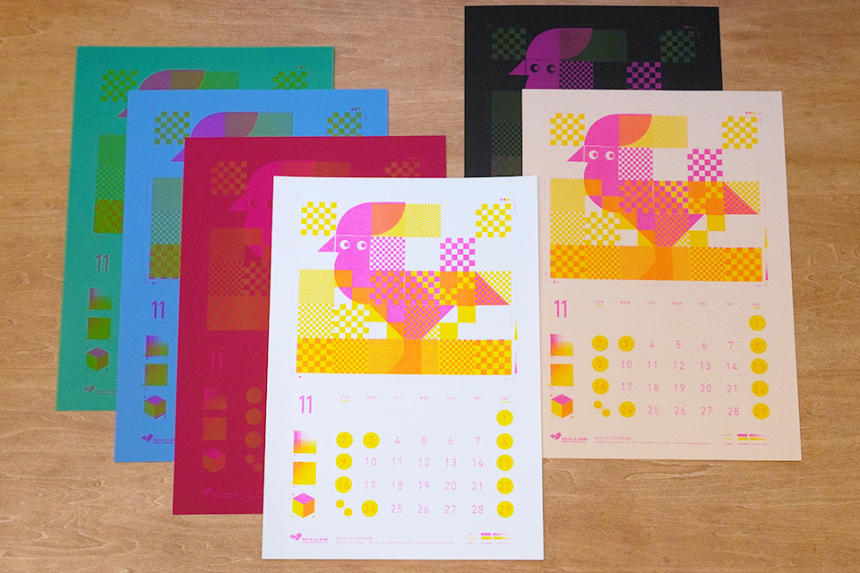 マンスリーカレンダーを印刷しながら、リソグラフの仕組みを学びましょう! 11月のテーマは「BIRD YARD」です。グラフィックの部分は仕上がりをイメージしながら、ご自身で版下を作成し、リソグラフで2色印刷します。
